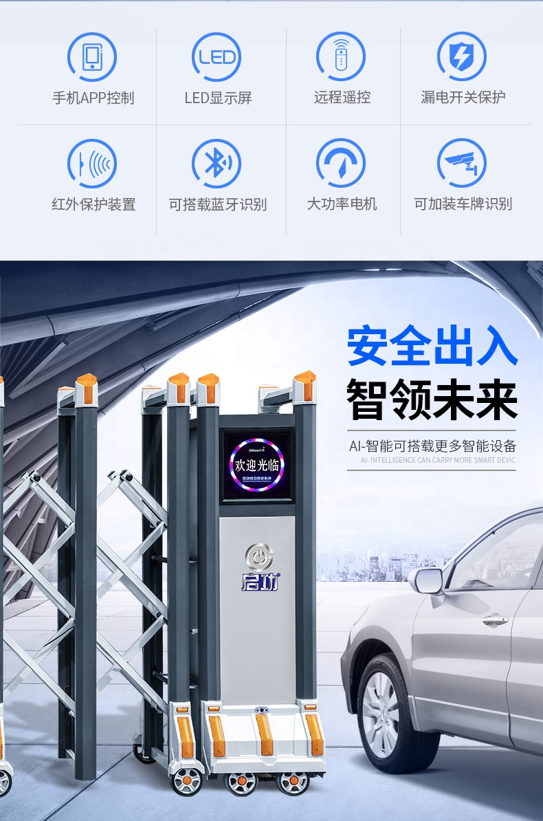 Aluminum expandable retractable gate QG-Q19 Type of gilding trackTrackless, Single track, Double trackPackaging DetailInside is bubble paper, paper carton, outside is wooden caseLED displayInput rolling words, and Static state display. With date & time availableDelivery Detail1sample 5days,20GP:......
